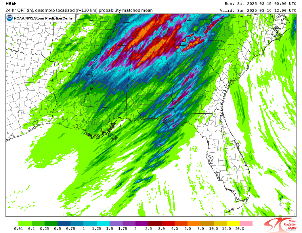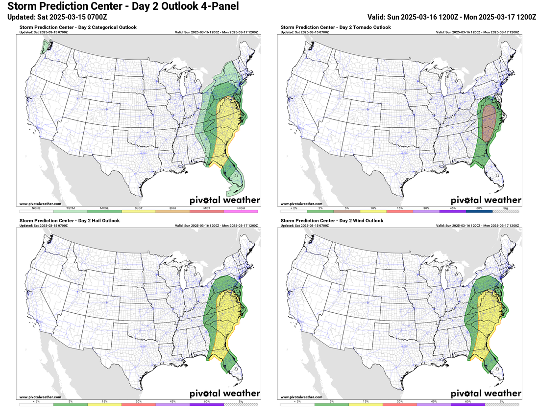 Finally, I don’t want to leave out that as this system continues to push east on Sunday, there will be an additional risk of severe storms from the Mid-Atlantic into the Carolinas and northwest Florida. SPC has a slight (level 2 of 5) risk out, with the main area of tornado risk from central Virginia down into South Carolina.