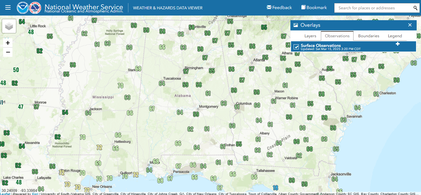The overall atmospheric setup generally favors the axis of most intense storms only slowly shifting east over the next few hours. This plot of low level dewpoints shows that moisture has been struggling to get into the eastern half of Alabama as dewpoints remain below 60F. The models have shown this fairly well – and the NSSL Warn-on-Forecast model has done a good job today in keeping the focus for tornadic storms locked in east and southeast Mississippi and far western Alabama. These models imply that after about 6 pm better moisture will finally start to return into the areas east of I-65/I-59 and conditions will likely become more favorable for severe weather.