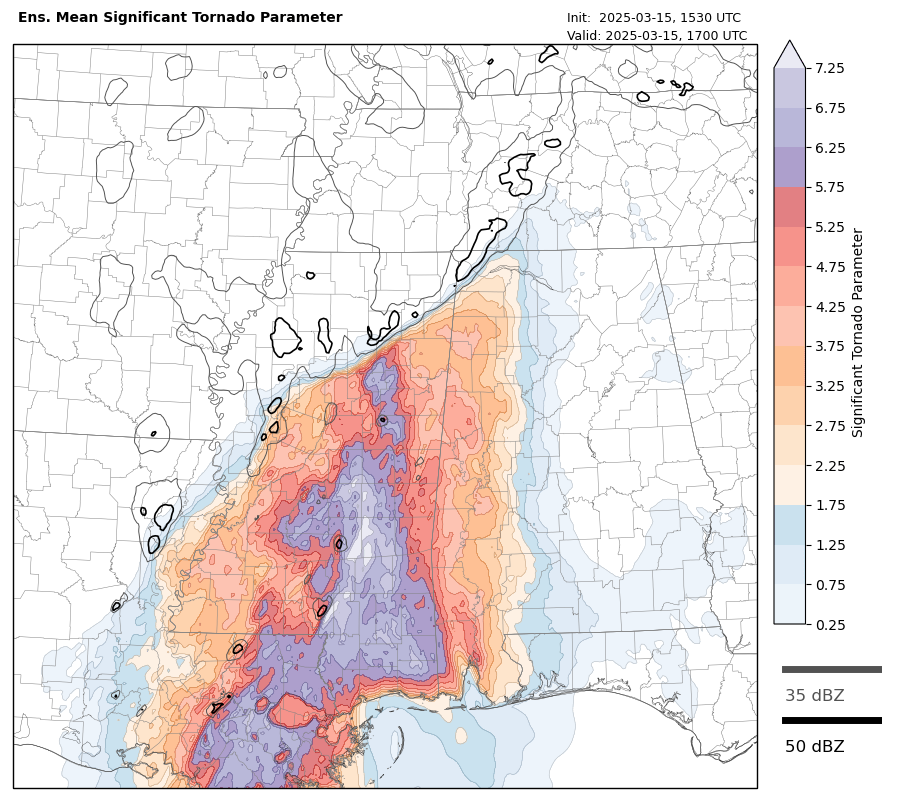 The other area of interest the next few hours are these supercells evolving in south central Mississippi and the Florida parishes of Louisiana. As the image below of significant tornado parameter for midday from the NSSL Warn-on-Forecast model shows, eastern Mississippi is becoming increasingly primed for significant tornadoes with time, values above 5 are very high. So these storms have real potential for long-tracked, intense tornadoes this afternoon.