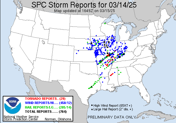 SPC has now received more than 750 reports of wind damage, tornadoes and large hail from the storms on Friday and Friday night.