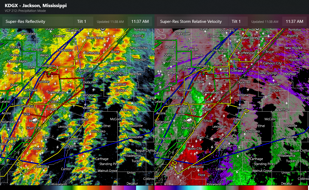 The first area is this area north and northeast of Jackson. This band of embedded supercells has been evolving the last few hours, and already produced a likely tornado near Grace in Issaquena County, MS. As it continues to shift east across the area in an area of increasingly favorable environment for significant tornadoes. SPC just issued a mesoscale discussion highlighting this area for potential intense tornadoes the next few hours.