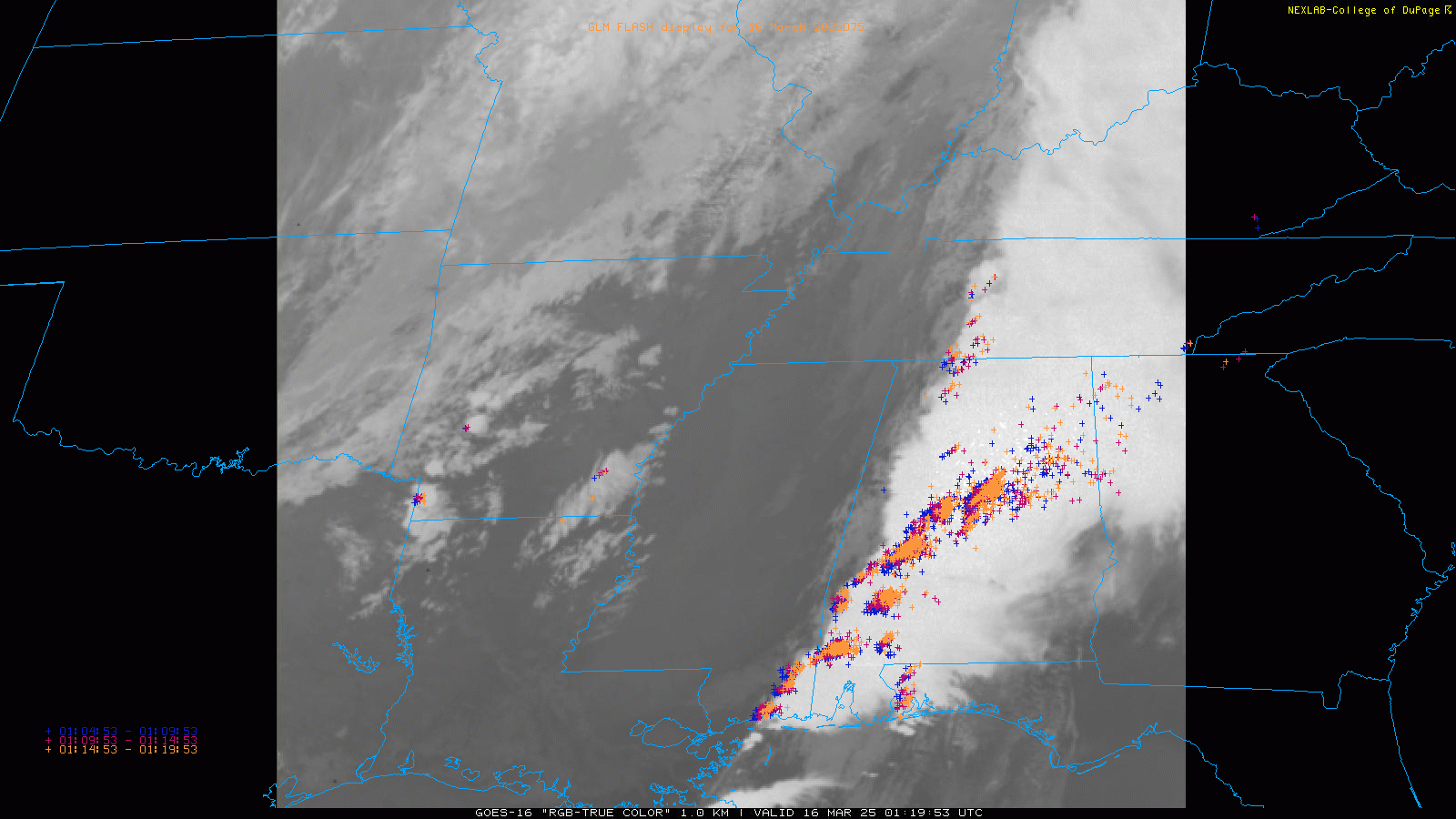 Looking at the evening satellite and lightning data, the storms appear to be becoming more discrete (individual) again, and several of the storms are now tornado warned. Another impulse in the mid and upper levels of the atmosphere is approaching from the west as shown by new storms developing in the Arklamiss area, and this impulse will likely support further intensification of the storms.