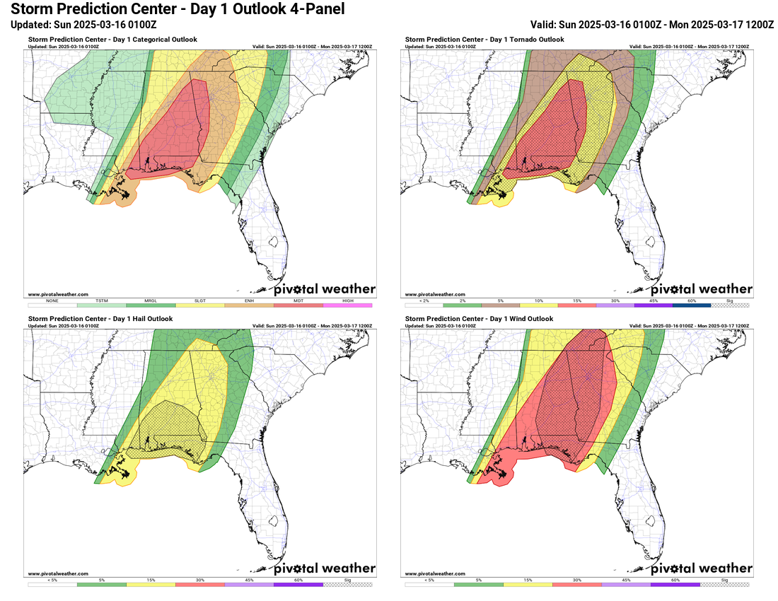 A moderate risk (level 4 of 5) remains in place from SPC along with tornado watches for much of Alabama; while the watches are no longer “particularly dangerous situation” watches, they still include the risk of intense tornadoes. Bottom line: strong/violent tornadoes remain very possible tonight across much of Alabama into western Georgia and parts of the Florida Panhandle, and people in these areas should have a way to receive warnings overnight.