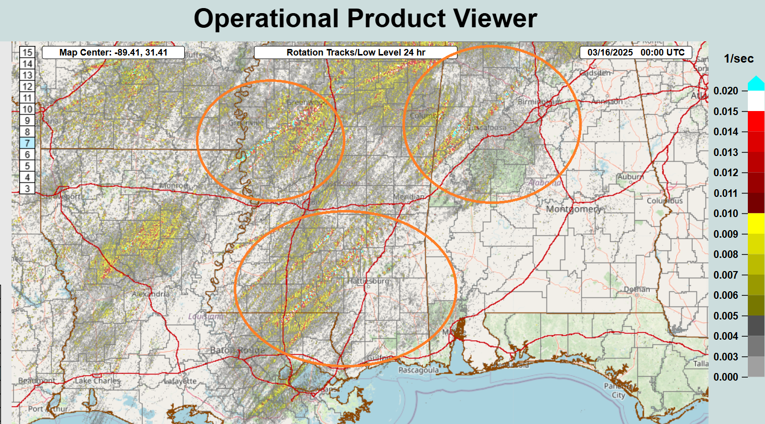 This graphic is the MRMS Rotation Tracks product, showing the paths of low level rotation from the various supercells that occurred today. The storms today occurred in 3 main areas and waves. The first was over the Mississippi Delta where a persistent rotating storm moved through in the mid to late morning, and produced a likely tornado near Grace in Issaquena County, MS, where injuries were reported.