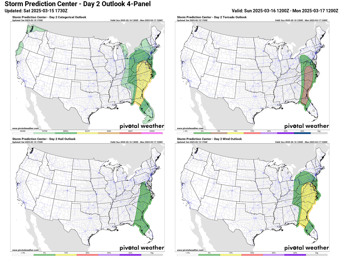 As this whole system continues east Sunday, the risk of severe weather will continue. While not as extreme a risk as the last 48 hours, there is still a slight risk (level 2 of 5) for the mid-Atlantic region into northern Florida as shown below. Evening high resolution models are showing a favorable environment for rotating storms in the slight risk area, so at least a few tornadoes are possible. More on this risk in our Sunday morning update.