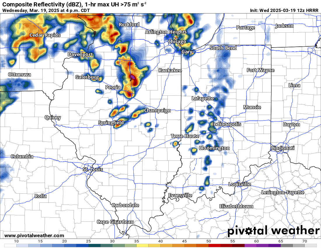 This image from the HRRR model gives an idea of what the radar could look like at 4 pm CT with a band of low-topped (not as deep into the atmosphere as big severe storms like the south had Saturday, but still intense) supercell storms moving across northern and central Illinois. While the unstable air will be somewhat limited, with intense forcing from the upper level system and strong wind shear in the atmosphere, conditions will be favorable for these supercells to potentially produce tornadoes, and as a result SPC has outlooked parts of Illinois into western Indiana for an enhanced (level 3 of 5, see below) risk of severe storms, primarily for the risk of tornadoes, a few of which could be EF-2 or greater.
