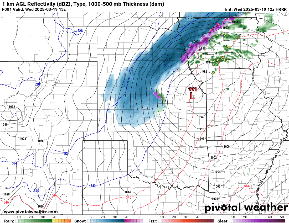 As we’ve discussed in the last couple of days, there will not be as widespread of a risk of severe thunderstorms with this weather system as the one last week, but that does not mean there is no risk. Recent forecast trends now show that just enough low level moisture is likely to get far enough north to near the track of the intense low pressure system to result in a narrow favorable area for severe storms. I’ve highlighted in the above instability forecast from this morning’s high resolution rapid refresh (HRRR) the area which is forecast to become unstable enough by early to mid afternoon to support severe thunderstorms just ahead of the cold front associated with this intense weather system.