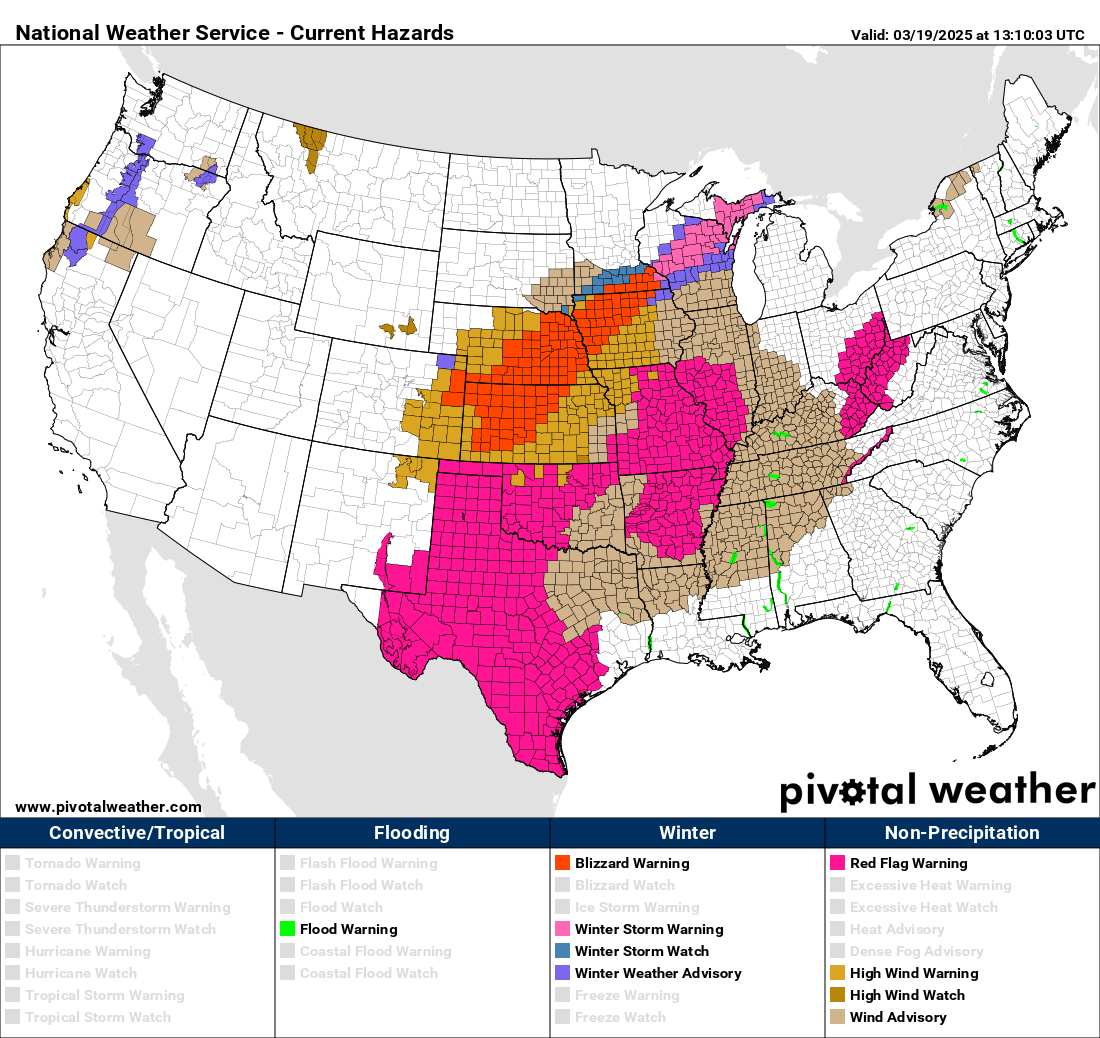 Along with the blizzard warnings in this area, winter storm warnings are in effect farther northeast (shown above) as heavy snow and winds (just not quite as strong as farther southwest) will create very difficult travel. Strong winds surrounding the strong low pressure system will cause issues with travel, downed trees, etc., and wind advisories and high wind warnings are in effect for much of the Midwest and mid-South. While fire weather conditions will not be as extreme as seen over the southern Rockies and Plains yesterday, strong winds combined with dry vegetation is resulting in Red Flag Warnings for fire danger over large areas of Texas, Oklahoma, the mid-Mississippi Valley and mid-South, and in parts of Ohio and West Virginia.