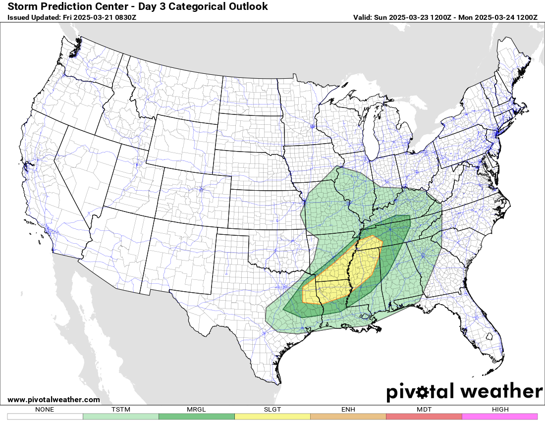 As this weather system moves farther east, it will begin to encounter some Gulf moisture return, supporting the development of thunderstorms starting late Saturday but especially on Sunday. Moisture return will be somewhat limited and the track and intensity of this system are not conducive to a large scale severe weather outbreak. Still, there will an area with sufficient instability and wind shear to support a risk of severe storms over the Arklatex and lower Mississippi Valley Sunday. As noted by SPC in their discussion, while conditions may support a tornado or two, wind damage and hail appear to be the primary risks with these storms. We will have updated info on this risk in Saturday’s newsletter.