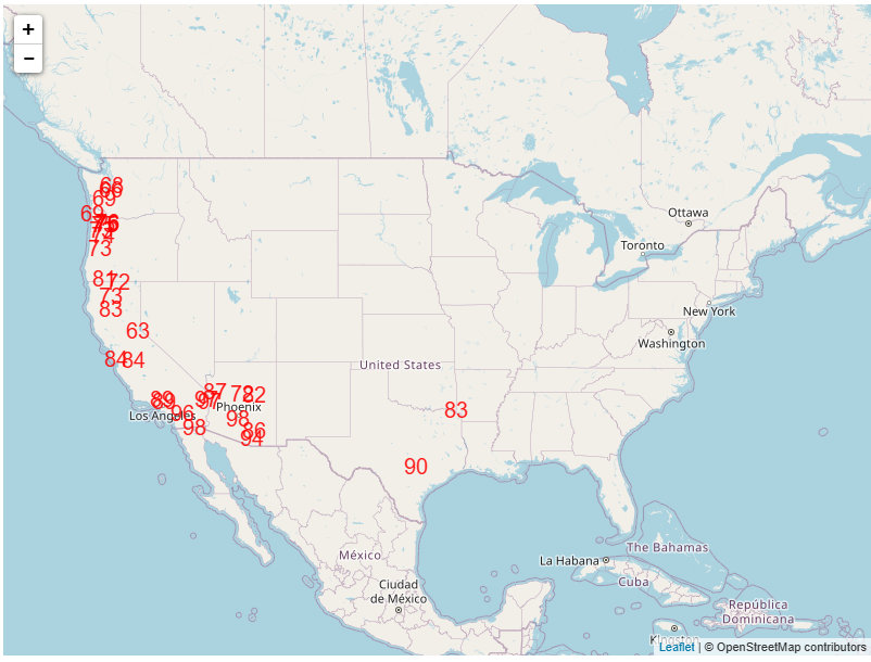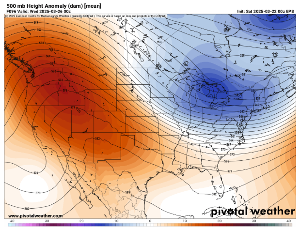Taking a quick look at the weather pattern for early next week, the overall pattern as shown above in the mid levels of the atmosphere at 500 mb – about 18,000 ft AGL, the level meteorologists use to monitor weather patterns in the mid/upper levels of the atmosphere – shows the western and central United States will be dominated by a large ridge of high pressure, while a trough of low pressure will be centered over the Northeast and Great Lakes. Overall, that will mean cooler than normal weather in the much of the east, while most of the western US will be warmer and drier than normal. A number of locations in the West are forecast to approach and potentially break record high temperatures (both maxes and mins) in the western and south-central United States next week. Below is the map from the Weather Prediction Center showing sites that will be near record high temperatures on Tuesday.