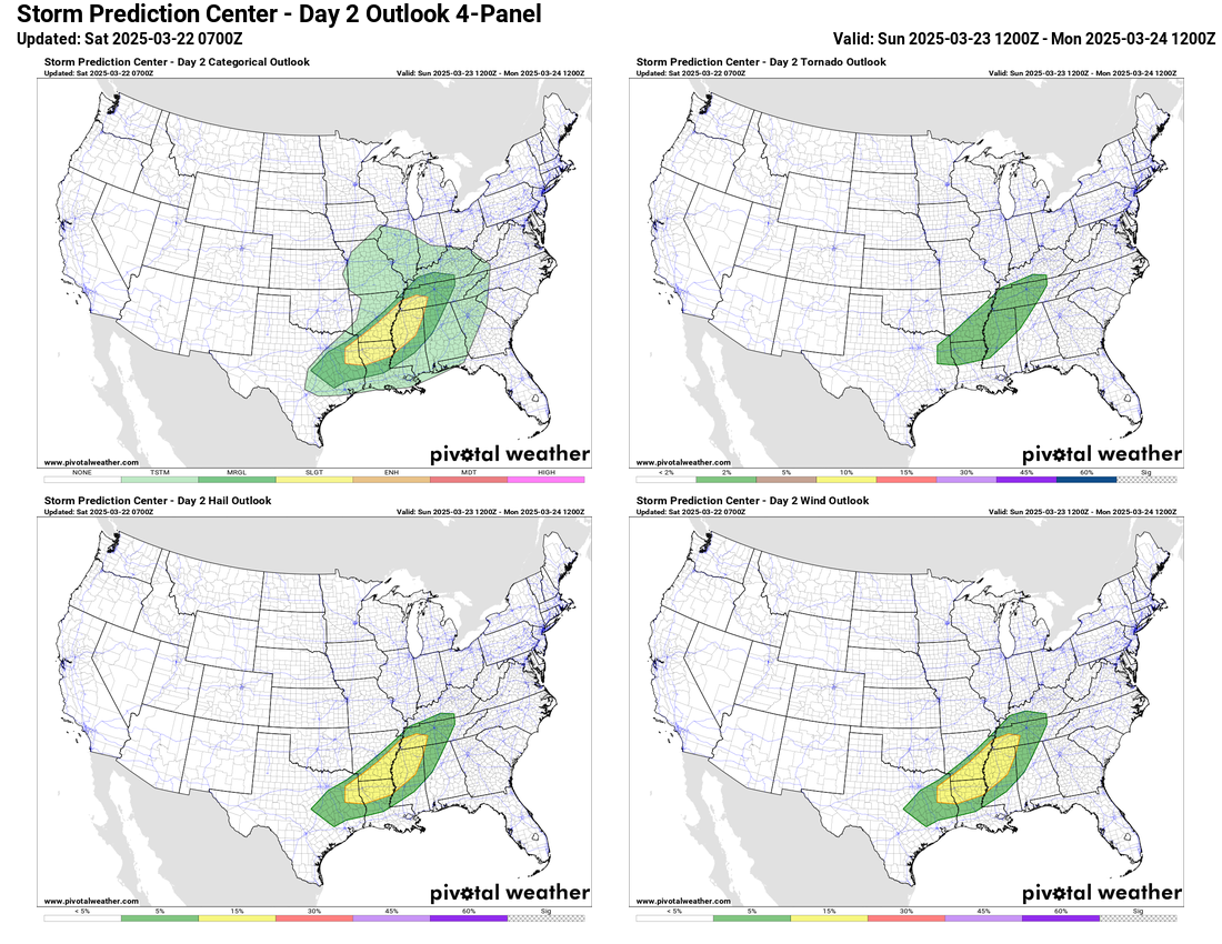 Later on Saturday and especially on Sunday, this weather system will begin to interact with modest Gulf moisture return to produce scattered thunderstorms over the middle part of the nation. Conditions will become somewhat supportive of severe thunderstorms on Sunday from the Arklatex into the lower Mississippi Valley. The track of this system to the north and northeast of the region combined with only somewhat support moisture and instability means that a significant severe weather episode is not anticipated. Still, SPC has outlooked the region in a slight (level 2 of 5) risk of severe storms, primarily for some incidences of damaging winds and large hail. A couple of tornadoes could occur, but wind shear in the lower levels of the atmosphere will not be particularly supportive, and SPC has the lowest level risk for tornadoes (upper right hand image above) forecast. A few severe storms producing hail are also possible this afternoon and evening over parts of Missouri and adjoining eastern Kansas and northeast Oklahoma/northwest Arkansas.