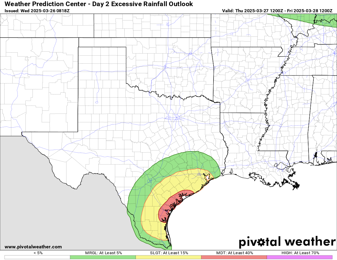 A separate disturbance in the southern branch of the jet stream will be moving across Texas the next couple of days, producing showers and thunderstorms across the state. The heaviest rain will be in deep South Texas, where a swath of 4 to 8” of rainfall is anticipated over the next 48 hours, and the Weather Prediction Center has placed a moderate risk of flash flooding today and Thursday as seen above.