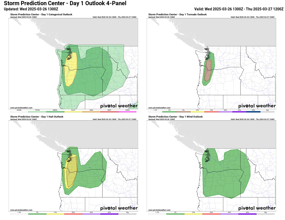 The unusual warmth in the Pacific Northwest is going to fuel a highly unusual risk of severe thunderstorms in the region today. An upper level trough approaching the coast will provide forcing and wind shear for severe thunderstorm development in western Washington and Oregon later this afternoon and evening. Given unusual levels of moisture and instability as well, several intense supercells capable of very large hail and tornadoes are possible. SPC has a slight (level 2 of 5) risk outlooked, including an explicit risk of greater than 2” diameter hail and a level 2 risk of tornadoes. You can read more about the rare meteorological setup in a special Balanced Weather post from yesterday afternoon. As I noted, there has only one report of 2” or larger hail in the last 75 years in western Washington and Oregon, so this is indeed a very rare meteorological setup.