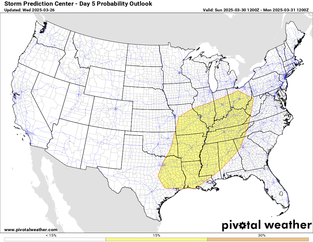 The weather system producing the severe weather in the Pacific Northwest today will shift the warmer weather east over the next couple of days, and when it reaches the Midwest this weekend will fuel another severe weather risk this weekend. Sunday looks like the primary day for severe weather with this system, and SPC has outlooked a large area from the Ohio Valley to the central Gulf Coast for the risk of severe storms. Not much has changed since yesterday; it still looks like this will be an event with a rather large area of favorability for severe weather and possible tornadoes, but we will need to get closer to the event to narrow down any areas with greater risks for higher end severe storms. The system will produce some risk for severe weather in the eastern U.S. on Monday, but as of now it appears the system will weaken even further by then.