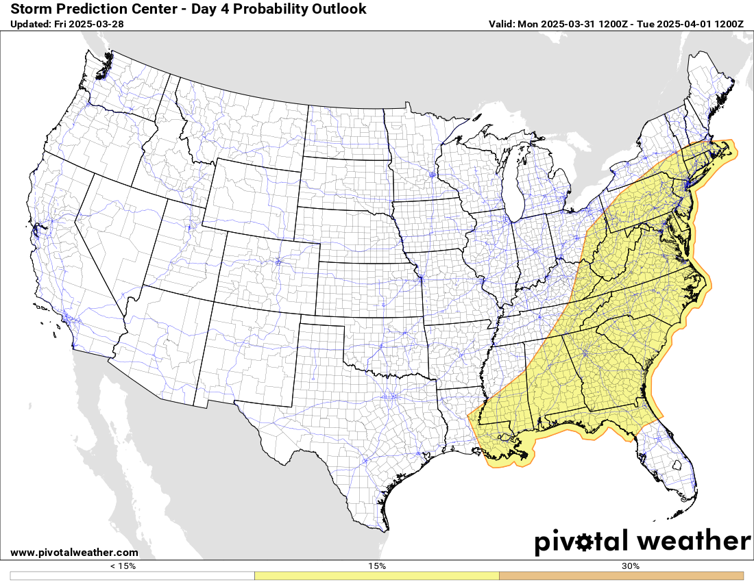As the system continues east, the threat of severe weather will shift with it, and SPC has outlooked much of the East Coast region in a 15% probability area of severe weather on Monday.