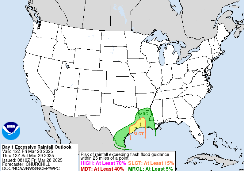 Luckily, it looks like the heaviest rains are starting to shift east of this region today, with the heavier rains expected in southeast Texas and southwest Louisiana. While the extreme rainfall that was seen in the RGV in not anticipated farther east, WPC has outlooked the region in a slight (level 2 of 4) risk of flash flooding for today.