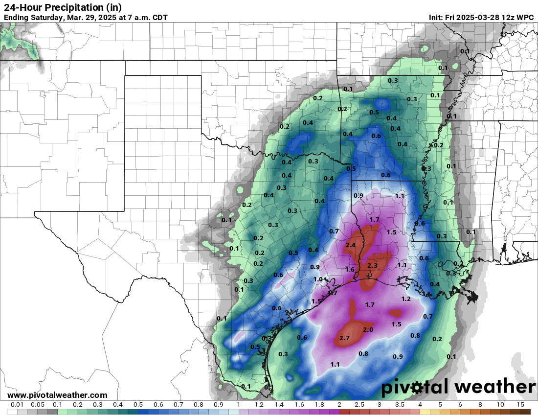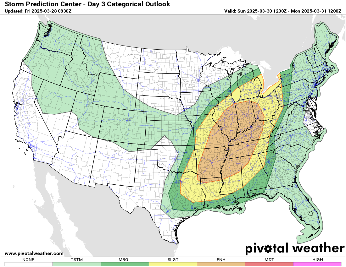 The severe weather risk for this weekend that we’ve been discussing for several days still looks on track. The risk of severe storms will begin increasing from northern Oklahoma to western Missouri later on Saturday as the responsible system begins to move east into the Plains. The threat will really ramp up and peak on Sunday, where SPC has outlooked a large area from the Arklatex and Arklamiss north to Indiana and western Ohio in an enhanced (level 3 of 5) risk of severe storms. As we have discussed over the last few days, this looks like a setup where a large area will be at risk for impactful severe weather, and some particularly intense severe storms with damaging straight line winds, very large hail and significant tornadoes could occur within this broader area. As we get closer to the event and start to get high resolution model forecasts, we should be able to better refine the risks from this event.