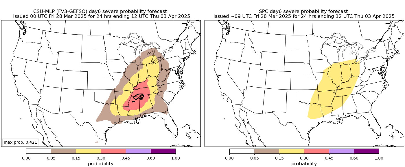 As discussed in my deep dive post yesterday afternoon, it still appears as though the weather pattern will be quite active for severe weather beyond this weekend’s system. The next day of interest looks to be next Wednesday, when a strong upper level disturbance should move across the Midwest. The Colorado State University machine learning system (CSU-MLP) is already highlighting a 30% probability area for severe along with a small hatched area for significant severe weather. I noted in my discussion yesterday that the CSU-MLP is based upon the NWS Global Ensemble Forecast System (GEFS), and for this particular setup next week there are still some rather important model differences as the European ensemble suggests the better threat of severe storms would be a bit more northwest of what the GEFS suggests. For now, as can be seen on the right hand image above, SPC is forecasting a large 15% probability area for severe weather. As of now, this system also looks to have the potential to produce a rather substantial severe weather episode, and we will continue to discuss the risk in coming newsletters.
