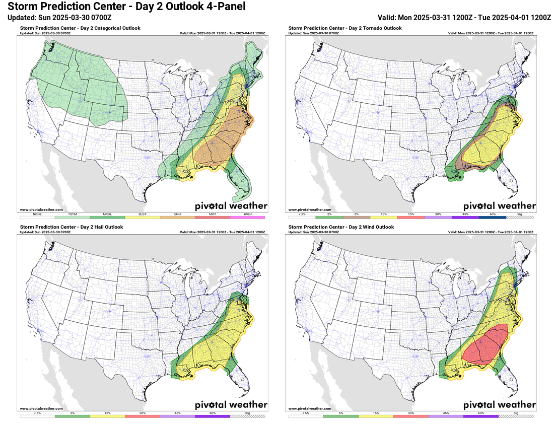 Strong to severe storms will likely be ongoing first thing Monday in parts of the lower Mississippi Valley and Southeast, and a continued risk of severe weather will exist through the day. SPC has outlooked an enhanced (level 3 of 5) risk for Monday as well from the mid-Atlantic to the eastern Gulf Coast. However, if you look at the probabilities for each of the three hazards you will see they are not as high on Monday as today, and there are no hatched areas outlooked. So while there is certainly a continued risk for severe storms with large hail, damaging winds and tornadoes, the risk on Monday is a bit less than what is anticipated today.