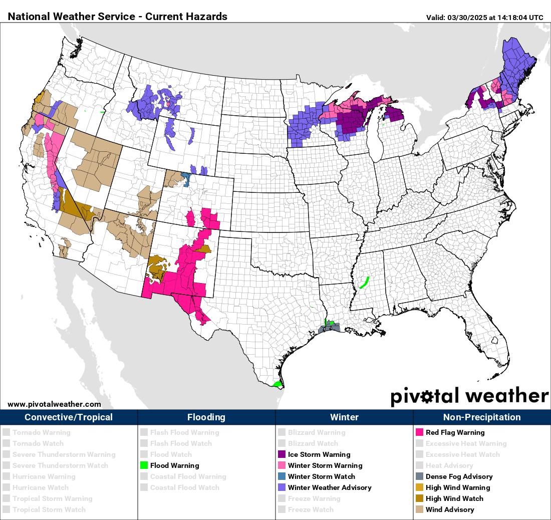 As we discussed yesterday, in addition to the all of the severe weather risks, there will also be fire weather risks on the southwest side of these systems and winter weather risks on the northern side of these systems. The fire weather risks look to be concentrated in New Mexico and western Texas, where elevated to critical to fire weather conditions are forecast the next few days and Red Flag Warnings are in effect. Wintry precipitation is forecast today across the northern Great Lakes into northern New England. Freezing rain will be a particular concern and Ice Storm Warnings are in effect in parts of this area. The system that will be the midweek severe weather concern will be coming into the western United States over the next 24 hours, and wind warnings/advisories and winter headlines for mountain snows are in effect there.