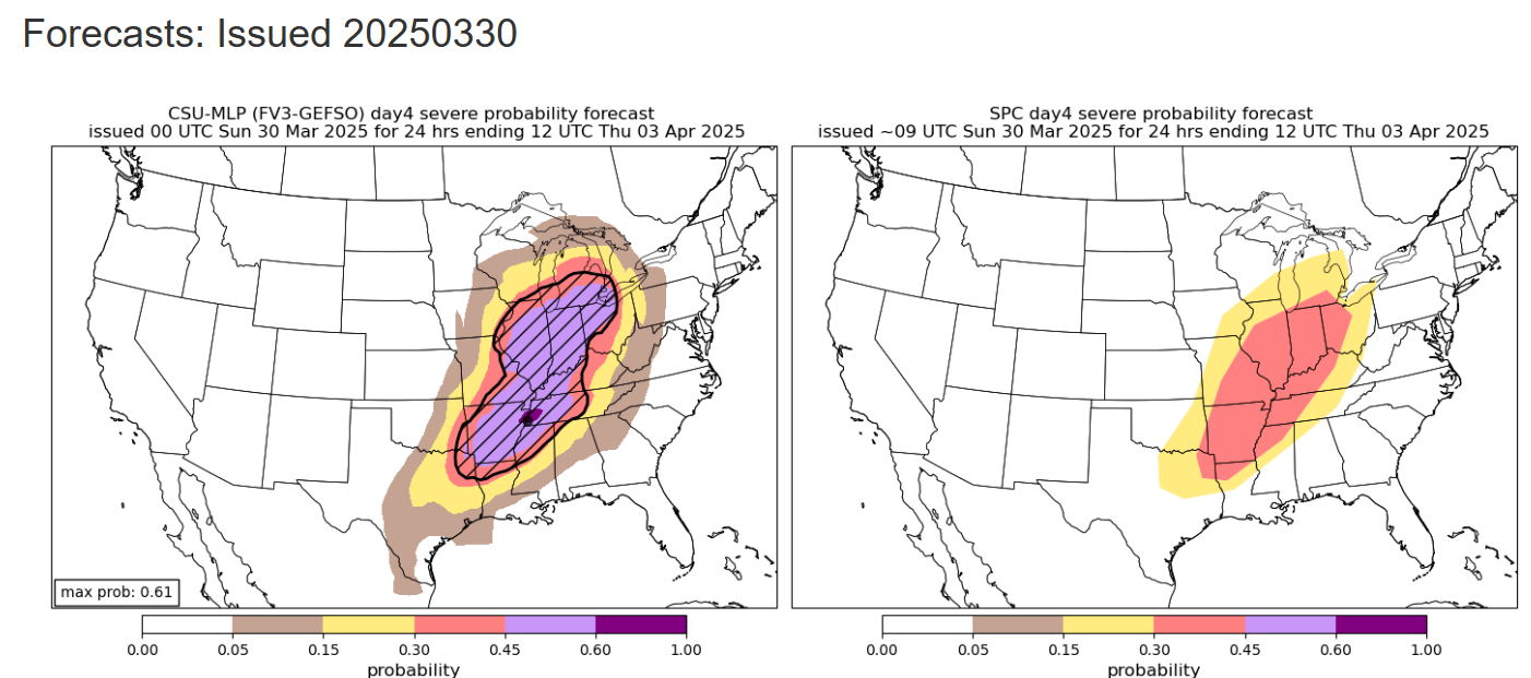 Once today’s system exits stage right by Tuesday, attention will rapidly turn to the next system which looks to have the potential to produce a high end day of severe weather on Wednesday. As you can see in the left side graphic above, the Colorado State University machine learning system has a large area of 45% severe weather probability forecast from the lower Great Lakes to the Arklatex, with the area hatched indicating the potential for significant severe weather (very large hail, damaging winds greater than 75 mph, and/or EF2+ tornadoes). SPC has a corresponding 30% area forecast, which is as high as they can forecast at this time range. SPC headlined their narrative discussion for Wednesday with the statement that a severe weather outbreak is possible Wednesday, which shows the concern they have for this setup.