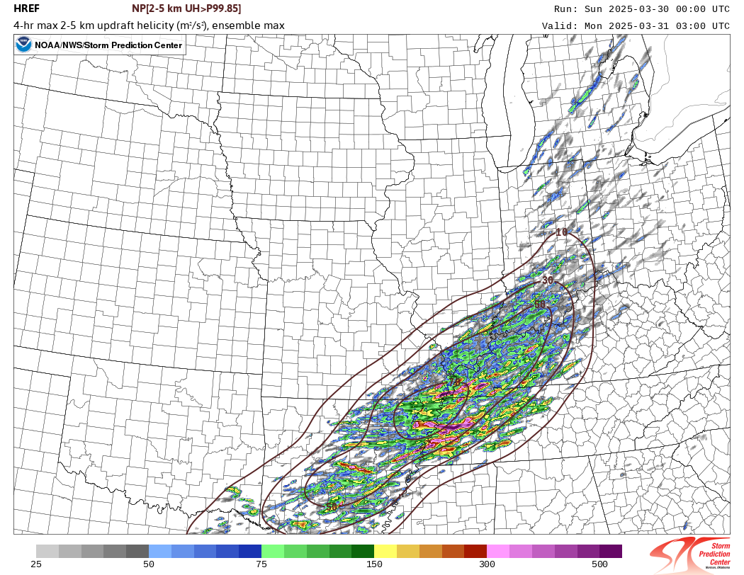As we have been discussing the last couple of days, the area that seems the most likely for significant tornadoes is in the lower Ohio Valley to mid-South region. This area looks to have the best overlap of instability, low level wind shear, and more favorable storm mode later this afternoon and this evening for a greater tornado risk. The above graphic shows thunderstorm rotation from all of the members of the High Resolution Ensemble Forecast (HREF) system, and as you can see there are a number of tracks. To be clear, any one of these model forecasts for storm rotation is unlikely to verify; what we are trying to do with the HREF is run a number of model scenarios to try to ascertain the areas more likely to have rotating supercell thunderstorms, and the number of tracks the HREF shows in the region helps us focus on this area for a greater risk.