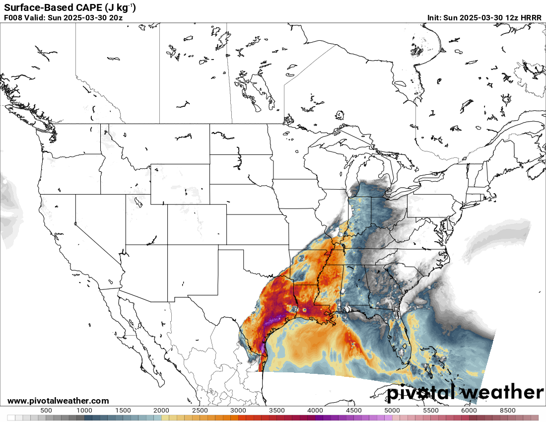 Those storms have weakened as they moved east, and overall things are relatively quiet this morning with a few clusters of storms in the mid-Mississippi valley and Texas. As the day goes on, a large swath of the middle part of the country from eastern Texas northeast into the southern Great Lakes region will become favorable for severe thunderstorms with rather high instability (shown above) and decent wind shear. This will set the stage for an active afternoon and night of severe weather.
