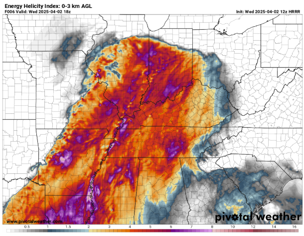 Ahead of the band of strong to severe storms, a large sector of warm, moist and unstable air with strong wind shear will become very favorable for severe storms and tornadoes as shown in this HRRR forecast of energy helicity index (EHI) for 1 pm. EHI combines instability and low level wind shear into a single product, giving meteorologists a quick idea of how favorable conditions are for tornadoes (in this case, very favorable).