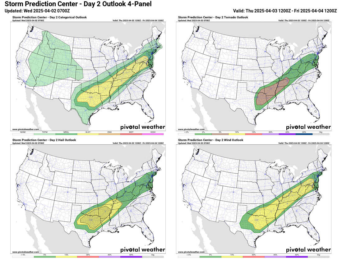 The highest probabilities for severe weather on Thursday look to be the general region of the Arklatex, where SPC has higher tornado probabilities and a hatched hail area forecast, while lower probabilities of severe storm hazards extend northeast from there into the Mid-Atlantic region. Right now all of the probabilities are only at slight risk (level 2 of 5) but it would not be surprising to see some areas increased to enhanced risk in later updates.