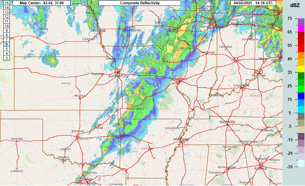 Welcome to Wednesday, the day that has looked like a severe weather outbreak for several days now. We start off the day with a band of strong to severe storms extending from northeast Missouri down to northwest of Dallas. This band evolved from an evening line of severe storms over parts of Kansas, along with a new band of severe storms that developed after midnight in Oklahoma after a couple of late afternoon Oklahoma supercells dissipated.