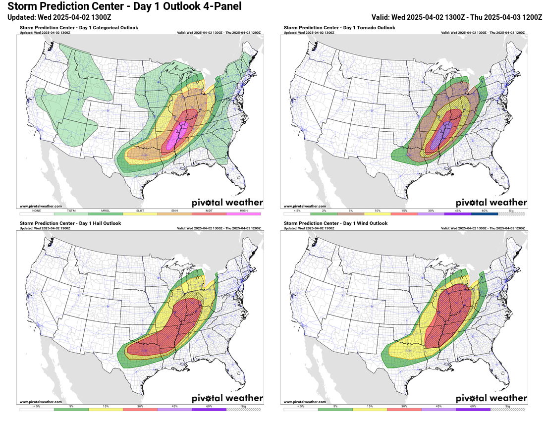 Given this setup, the Storm Prediction Center has outlooked a large area from the lower Great Lakes to the Arklatex with high probabilities for tornadoes, hail and damaging wind, all with hatched areas, meaning at least a 10% probability for significant incidences of these hazards, i.e., EF2+ tornadoes, 2+” hail, 75+ mph wind gusts. This results in a large area of enhanced (level 3 of 5) and moderate (level 4 of 5) risks across the area, along with a narrow high risk (level 5 of 5) in the area with the absolute highest probabilities of tornadoes from eastern Arkansas to the Ohio/Mississippi River confluence area.