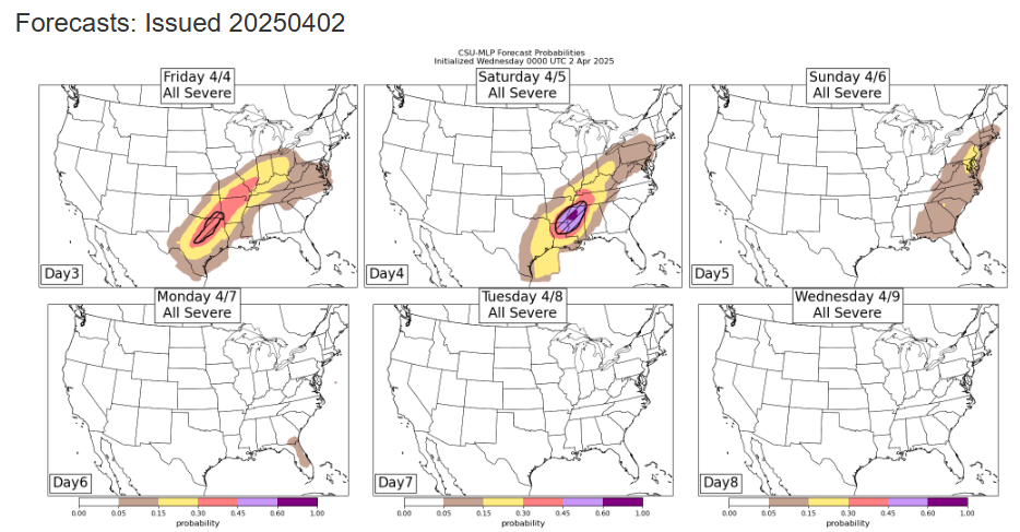 Active severe weather will continue through the weekend as the main Southwest US mid/upper level system finally pulls east. The Colorado State University machine learning system probabilities show an increasing risk for severe storms into Saturday from Texas east into the lower Mississippi Valley. After a lesser risk of severe storms along the east coast Sunday, the passage of this system across the country will force a significant pattern change with a mid/upper level trough of low pressure becoming established in the eastern United States, shutting down the active weather pattern for a while.