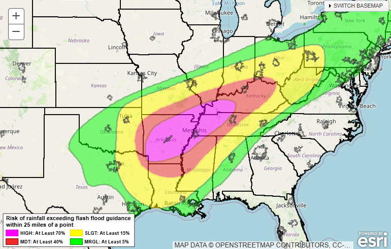 The area that looks the absolute greatest at risk today looks to be western Tennessee, eastern Arkansas and northern Mississippi which looks to be the region that will have training of storms for the longest period of time. Much of Kentucky – both the high and moderate risk areas – are also serious concerns given the huge amounts of rain that have already fallen and terrain that is particularly vulnerable to flash flooding. Anyone under the WPC risk areas should be alert to flooding issues today and be sure to avoid driving through flooded areas. In fact, the NWS Little Rock office has specifically advised people to stay off the roads if at all possible today due to the already ongoing serious flooding which is expected to worsen today.