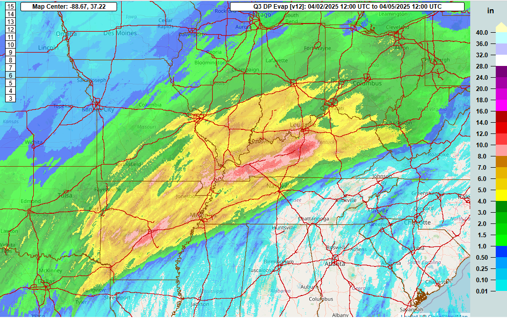 Of course, this was day 3 of this multiday severe weather and flash flood event, and rainfall totals continue to add up. Nearly all of the area from Arkansas up through the Ohio Valley has seen more than 4” of rain in the last 3 days, and much of Kentucky has now seen more than 8” of rain. While today will finally be the last day in this event, unfortunately for some areas in the Mid-South today will likely be the day of heaviest rain, with much of the entire region seeing additional heavy rainfall. This rain on top of already saturated, flooded conditions will yield flooding that the National Weather Service has warned could be “generational.”
