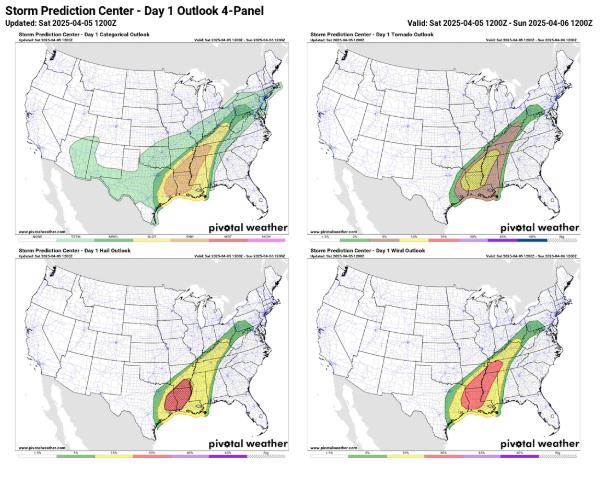 Finally, later tonight into Sunday the stuck weather pattern of the last week will begin to dramatically change. As a strong upper level trough of low pressure begins to develop over the Northeast US, it will pull the upper level weather system we’ve been discussing into the Southeast and force it to weaken. It will produce one more day of severe weather risk in the Southeast on Sunday, but the risk of storms should be less than we have seen with a slight (level 2 of 5) risk currently outlooked. Still, though, a band of severe storms with damaging winds and a few tornadoes looks probable in the region Sunday before the system gets completely absorbed into the new trough developing in the Northeast.
