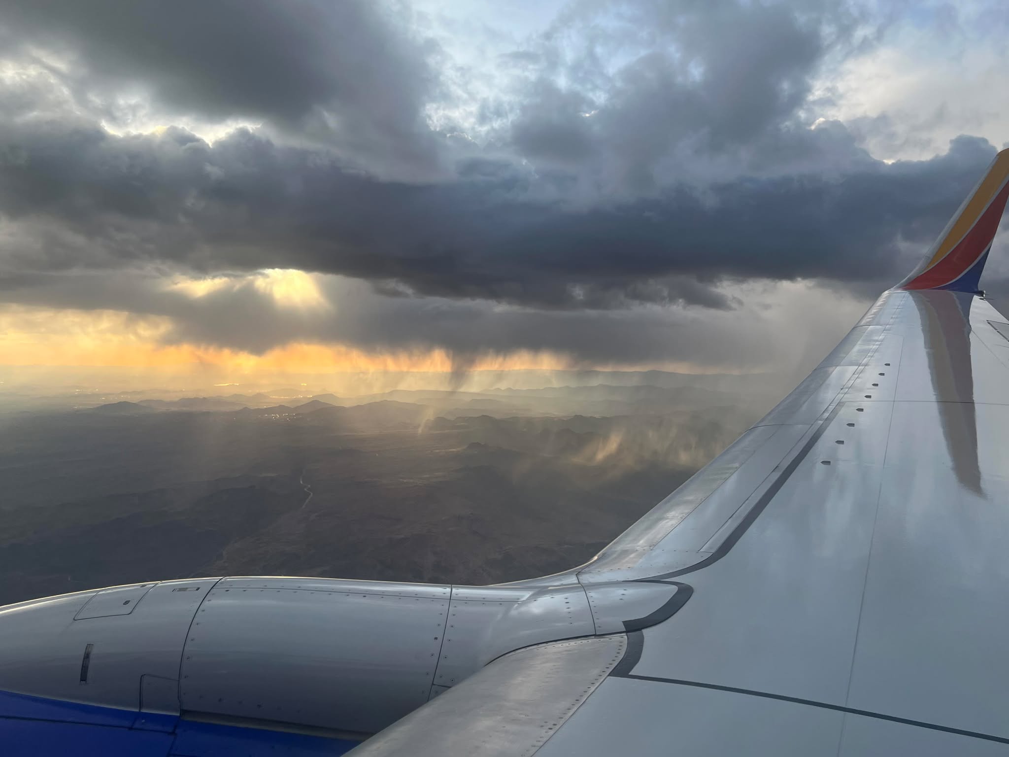 I am writing today from Phoenix where I am visiting my son. When the flight attendant was making the announcements for our final descent when we flew out here Saturday evening, she warned that “things were going to be a little bumpy on the way down” so that everyone needed to be sure they were buckled up. I was sitting in a window seat but hadn’t been paying too much attention to the view outside because it had been fairly clear (and to be honest, because I was watching the Final Four on my cell phone.) After hearing the announcement about turbulence, I took a look out the window, and was immediately in meteorological heaven, as this was the site that greeted me.