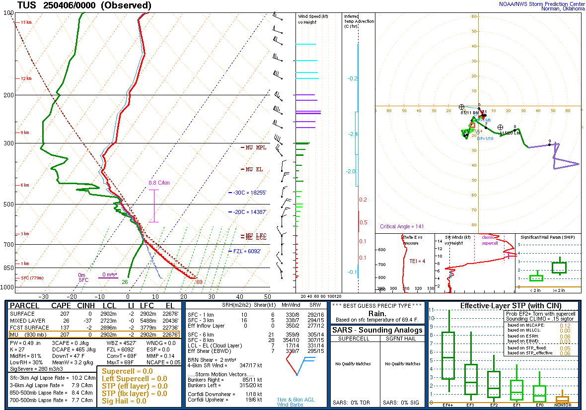 This sounding is a fairly classic example of what meteorologists refer to as an “inverted-V” sounding. It is called that because of the dramatic appearance of the temperature trace (red) and dewpoint trace (green) which shows the atmosphere becoming increasingly dry in the lowest 8,000 feet of the atmosphere, forming what has an appearance of an upside down letter V.