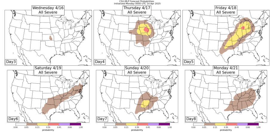 After this system moves off the East Coast over the next 24 hours, things will be quieter for a couple of days, but then a new storm system will take shape over the Rockies and move east, bringing a risk of severe weather on Thursday and Friday as shown by the Colorado State University machine learning (CSU-MLP) system. This system will exit to the east on Saturday, but it looks to be the harbinger of an overall trend toward a pattern of more storm systems developing over the western United States and tracking east or northeast through the Midwest. This should bring additional risks of severe storms into next week in the central United States along with possibly some heavy rainfall risk.