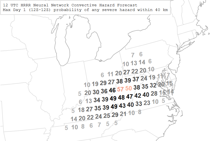 The morning high resolution models have trended somewhat more aggressive with this scenario, and the morning National Center for Atmospheric Research (NCAR) machine learning guidance has rather high probabilities for a severe weather report centered on West Virginia. It seems likely we will see several severe storms develop in the region with large hail and damaging winds the main risk, but a couple of tornadoes are also possible.