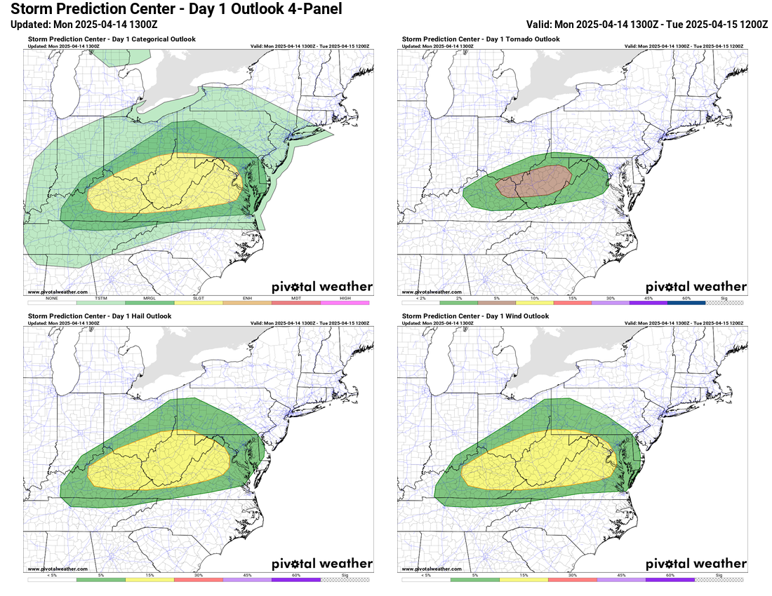 The storm system that developed over the upper Midwest this weekend will push into the Great Lakes region today. Ahead of the associated cold front, morning satellite imagery indicates there will be plenty of sunshine to create a warm and decently unstable airmass across the upper Ohio Valley and central Appalachians region. This will yield an environment supportive for some supercell severe thunderstorms, and the Storm Prediction Center has outlooked a slight (level 2 of 5) risk of severe storms for the region.