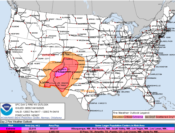 By Thursday, conditions will trend more dangerous as the storm system further intensifies and strong winds at low and mid levels of the atmosphere overspread a larger region. By mid to late afternoon, the area from western Kansas across New Mexico and into western Texas is anticipated to see single digit value relative humidity and winds gusting over 40 mph, resulting in a large area of critical fire danger.