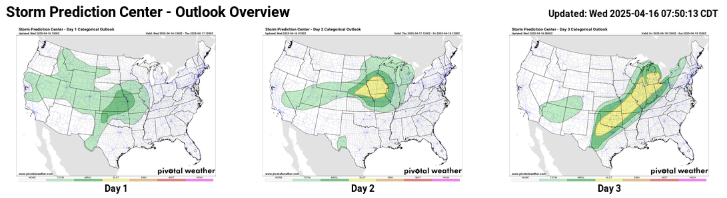 A few severe storms with large hail and gusty winds are possible from the Texas Panhandle to the mid-Missouri Valley, and SPC has outlooked a marginal (level 1 of 5) risk for this region. This storm system is expected to bring a somewhat greater risk of severe storms Thursday and Friday as can be seen in the day 2 and 3 outlooks. As of now, SPC just has a slight risk (level 2 of 5) outlooked for both days. On Thursday, some of the storms look to have the potential to produce very large hail, but the tornado risk looks fairly low. Friday sees the slight risk expand along a broad area as a few severe storms will be possible along a southeast moving cold front, but as of now there does not appear to be a focused area of higher severe potential.