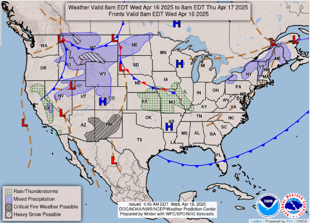 Running a little late this morning (sorry), so will make this morning’s newsletter focused on the weather concerns of the next several days. Let’s start off by taking a look at today’s forecast weather map. A new storm system is beginning to take shape in the northern Rockies. Heavy late season snow is expected in Montana where winter storm warnings and winter weather advisories are in effect. Farther south, scattered thunderstorms are expected to develop later today and tonight across parts of the central and southern Plains.