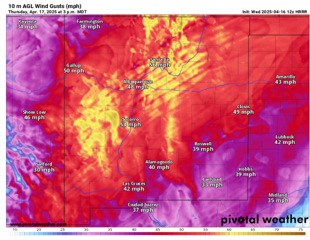 Of particular concern is central into northeastern New Mexico, where high resolution models suggest the potential for several hours with wind gusts greater than 50 mph along with particularly low relative humidity values around 5%. SPC has outlooked this region for extremely critical fire danger with the potential for a significant fire weather event with extreme fire behavior should any wildfire ignitions occur.