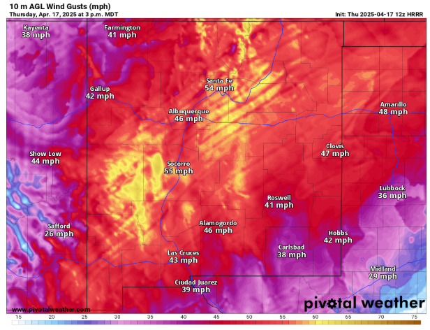 Within this area, the core of strongest low and mid level winds over New Mexico will correspond with an area of relative humidity values near 5%. This will result in particularly dangerous conditions for rapid wildfire spread, and SPC has outlooked an extremely critical fire risk for this area.