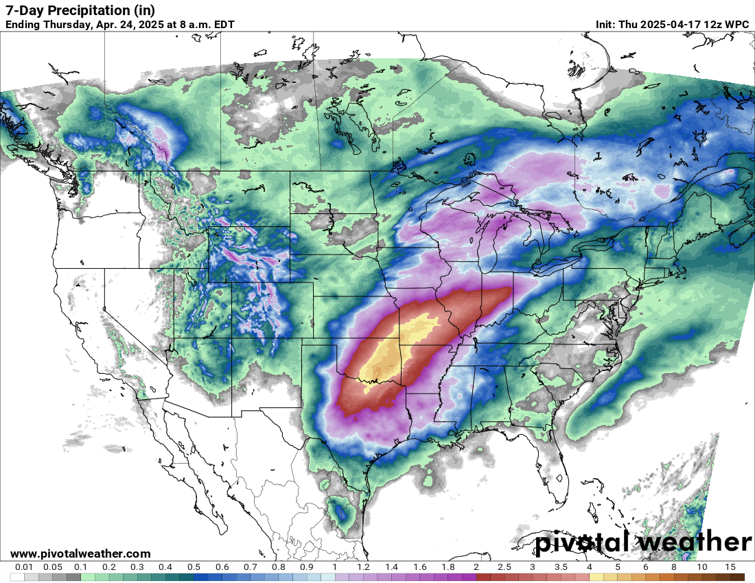 This pattern with waves of storms moving along a stationary front will result in another multi-day heavy rainfall event. This event will not be nearly as heavy or prolonged as the one we saw in early April, and will also be focused a bit farther northwest, centered from Oklahoma into the mid-Mississippi Valley. Western parts of this region are in drought, so initial rainfall will be beneficial, but repeated rains could result in some flash flooding concerns even here. Areas farther to the east in the mid-Mississippi Valley and lower Ohio Valley region are much wetter and still experiencing significant river flooding from the early April event, so additional heavy rain here will likely exacerbate and prolong flooding issues.