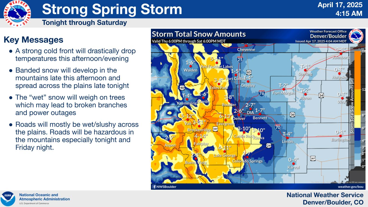 NWS Denver/Boulder is forecasting heavy wet snow in their region later today through tonight and Friday that will occur after Denver sees high temperatures in the lower 70s today – things change fast there!