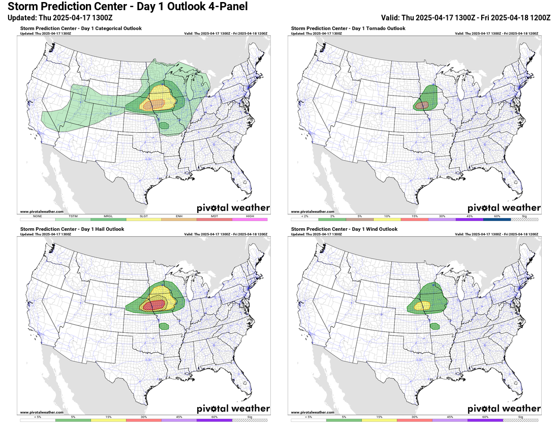 The overall situation looks a bit more potent than earlier forecasts had shown, and the NWS Storm Prediction Center has an enhanced (level 3 of 5) risk of severe weather that includes Omaha and Des Moines. While very large hail (possibly baseball sized or larger) is the primary severe weather hazard, a few tornadoes are certainly possible. The tornado risk primarily hinges on the amount of low level moisture that makes it to the region before storms develop, and if that low level moisture were a bit more than forecast, the tornado risk would increase. This will be something we will be watching today and this evening.