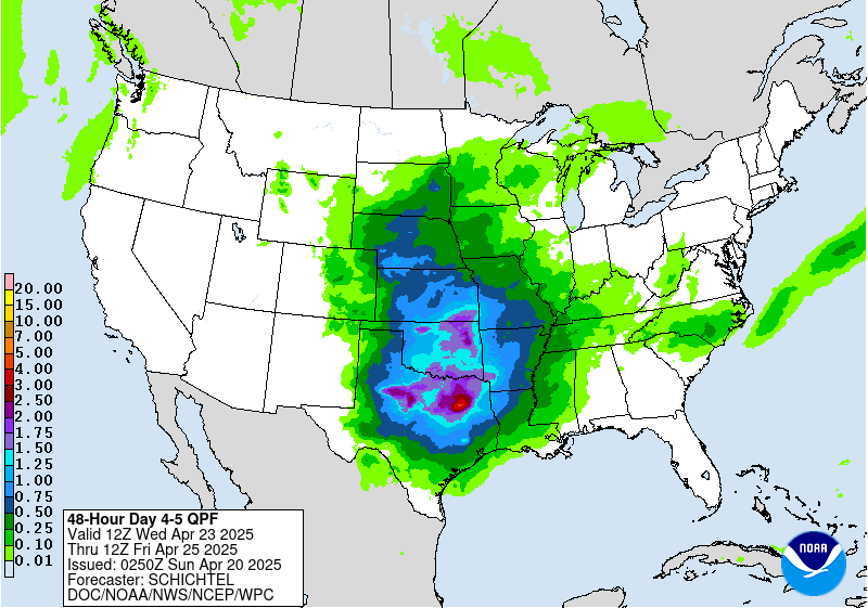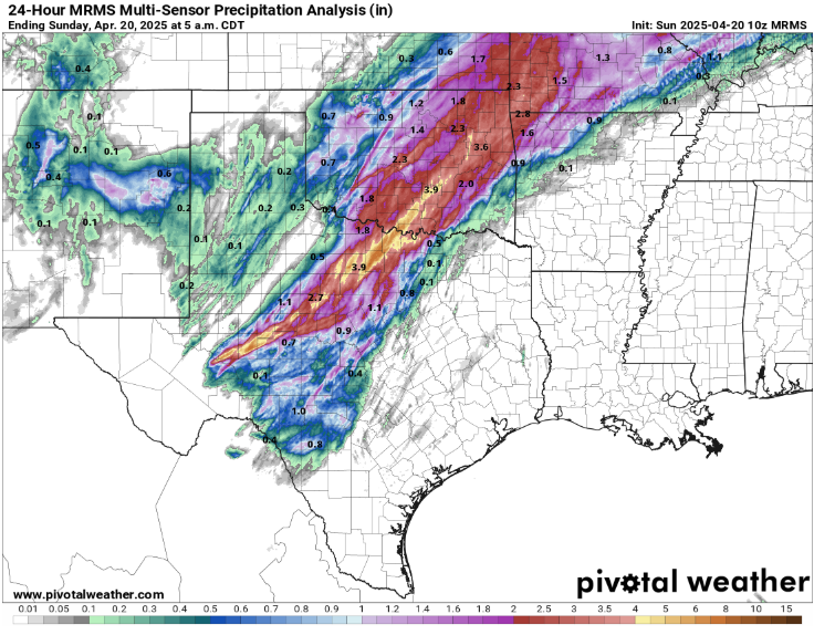 In addition to the severe weather, a swath of very heavy rainfall accompanied the southern Plains storms, with morning MRMS 24-hour rainfall estimates showing amounts greater than 4” common along the main band of storms. The highest observed amount I have seen so far is 8.18” at a CoCoRaHS site in Nocona, TX.