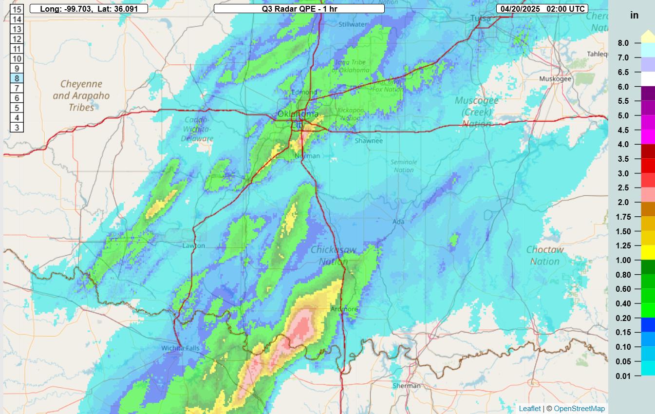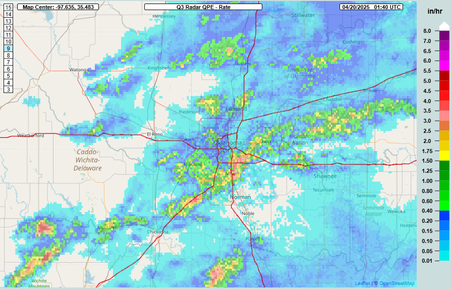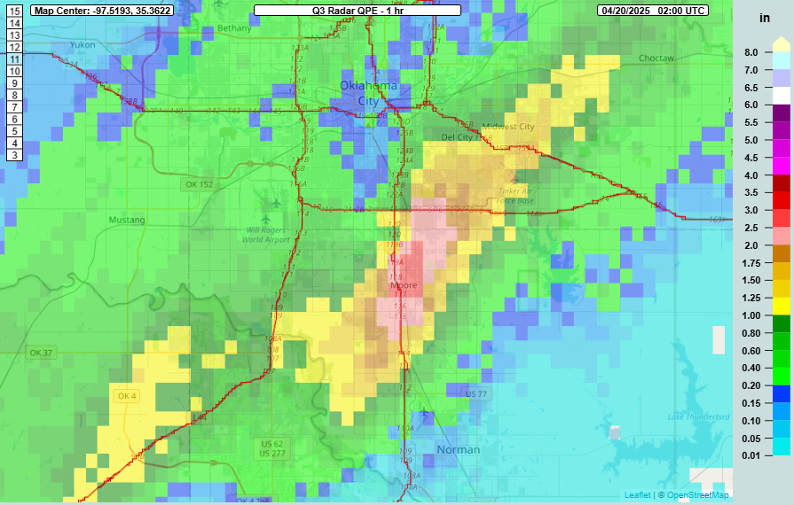 To look at what transpired with the flash flooding in the Oklahoma City area Saturday night, we can start by looking at the Multi-Radar Multi-Sensor (MRMS) rainfall rate product for around the time of the flash flooding. (Real-time operational MRMS products can be viewed here.) This product is generated using radar data, and showed that thunderstorms with rainfall rates of 3 to 5 inches per hour were moving through the southern and eastern parts of the metro area. This is an instantaneous rainfall rate, in other words the rate of rainfall occurring at any given moment.